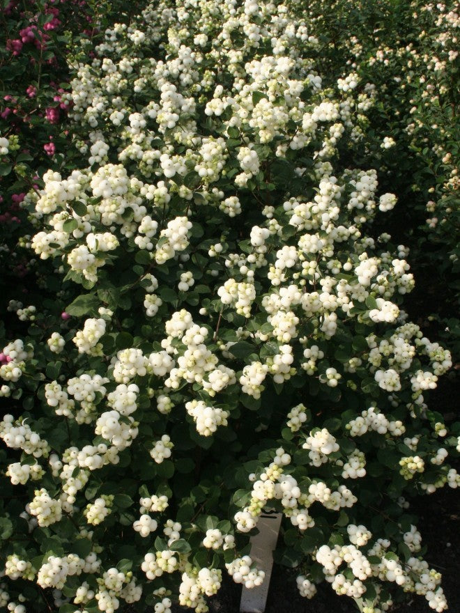 A hybrid selection, Symphoricarpos x doornbosii combines the best of its Snowberry lineage, offering improved berry set, sturdier stems, and a neat, rounded growth habit. Its oval green foliage provides a lush backdrop in spring and summer before giving way to its snowy fruit display. Even after frost, the berries persist, making it a magnet for songbirds and a visual highlight in the landscape.