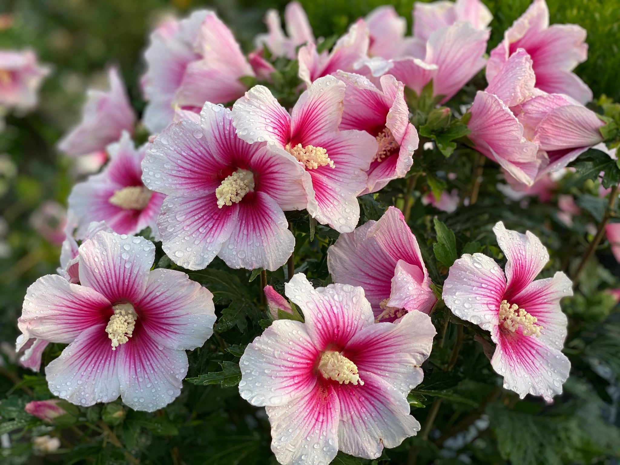 The true star of the show is the flower. Each bloom is significantly larger than conventional Hibiscus syriacus varieties, opening wide to reveal a pristine white petal surface. At the heart of each flower lies a vivid, star-shaped splash of deep pink that looks as though an artist took a brush and flicked a drop of ink into the center. These nectar-rich centers act as a bullseye for local pollinators, bringing a flurry of activity from hummingbirds, butterflies, and bees to your yard throughout the hottest months of the year.