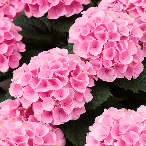 The Elizabeth Ashley™ Hydrangea PP# 31264 (Hydrangea macropyhlla 'Hokomarore') has perfectly shaped, uniform blooms on a small compact plant that are bright pink with lighter edges. The deep-green foliage with textural, toothy edges is dense and compact.