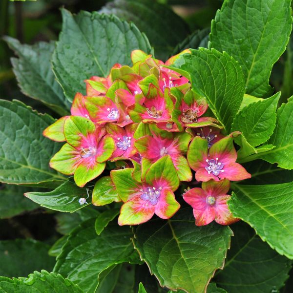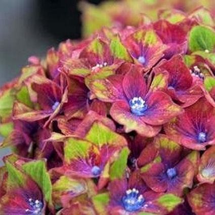 These big bold mophead blossoms begin their show in spring and continue right up into fall! Each dazzling, double floret is lime green with a dramatic splash of hot pink and a purple eye. This plant's florets snuggle together to form an impressive mophead that you have to see to believe! Large leaves of deep green complete the floral picture for a stand-out in your yard like no other.