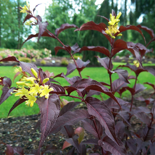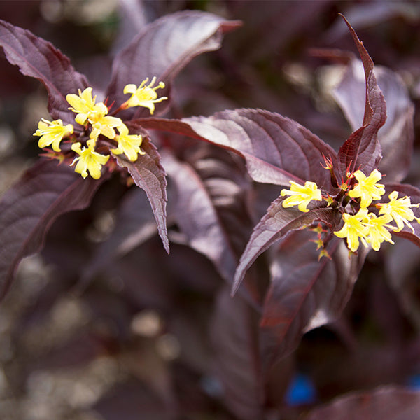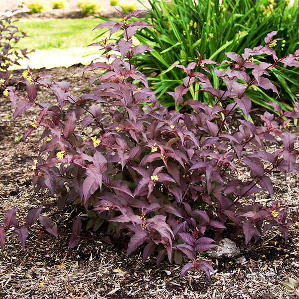 Fireflies in the night sky! The Firefly™ series Nightglow™ Bush Honeysuckle (Diervilla x splendens 'El Madrigal') features dark reddish-purple foliage and yellow blooms! Upright growing and dramatically hued, it's a mix of dark burgundy, bruised purple, and dark red foliage! Creating the perfect backdrop for the tiny, bright sulfur-yellow flowers in the summer, just like Fireflies in the night!