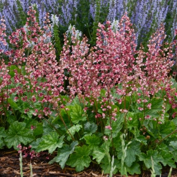 Berry Timeless looks fresh and frankly ethereal. Long, straight scapes rise well above the maple-shaped foliage and each features dozens of dainty, pink, bell-shaped flowers. As the pale-pink blooms fade, they age to a lovely deeper rose-red. But unlike other Heucheras, this natural hybrid retains the dried blooms, which are produced in tight wands through the season!