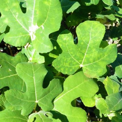 Chicago Hardy Fig developed into an attractive upright shrub or small tree, with distinctively leathery, dark green three-fingered leaves. These leaves are gigantic - growing up to 10 inches long!