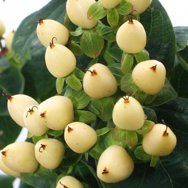 Magically white fruit and hardy easy-care Mystical White St. John's Wort (Hypericum 'Mystical White') really stand out in your floral arrangements and your landscape! Future brides and floral designers take notice! For incredible bouquet additions, the creamy-white fruit of White Hypericum in the fall is a highly decorative addition to the garden in the fall, and floral design alike!