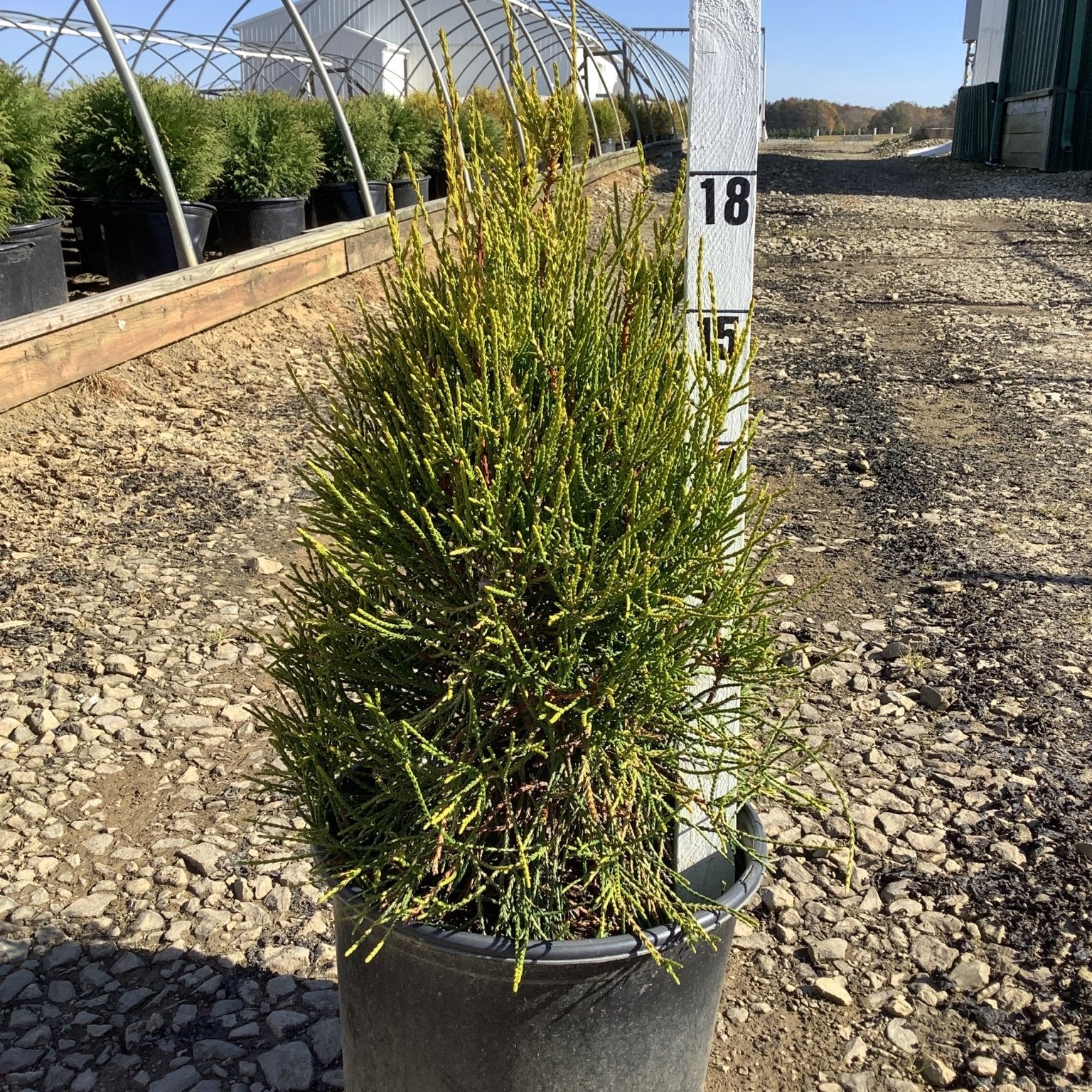 Franky Boy Chinese Arborvitae is naturally pyramidal in form, reaching about 4-6 feet tall and wide at maturity. The foliage is soft and flexible—almost like fine, windswept lacy fringe—and densely packed on upright to slightly spreading stems. New growth is a zingy lemon-lime shade that glows in the landscape! In fall and winter, the gold turns into warm, bronzy tones, extending its appeal year-round.