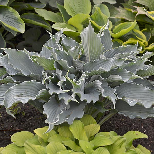 If you have a tiny plot or only have room for a single container, use a single species planting of multiple Waterslide Hosta. You'll love the blue wave delivered by these showy foliage plants. Use groupings in at least three, if you can, or run them in a long ribbon of incredible color and texture along the edge of your planting bed. Space them 30 inches apart on center, measuring from the center of one to the center of the next and enjoy their groundcover beauty.