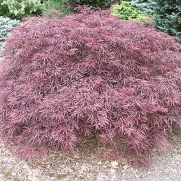 The lacy leaves are accented in the spring with red flowers the bees seek out. Red Dragon keeps its tremendous deep color in sun or shade too! Far better than any other Laceleaf Maples! This radiant Japanese Maple is not only finely textured with its heavily dissected foliage, but also its heavily saturated purplish-crimson and scarlet color that glows!