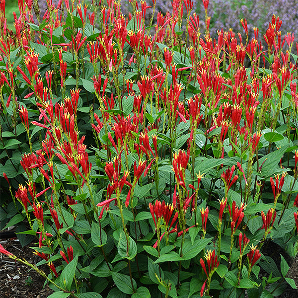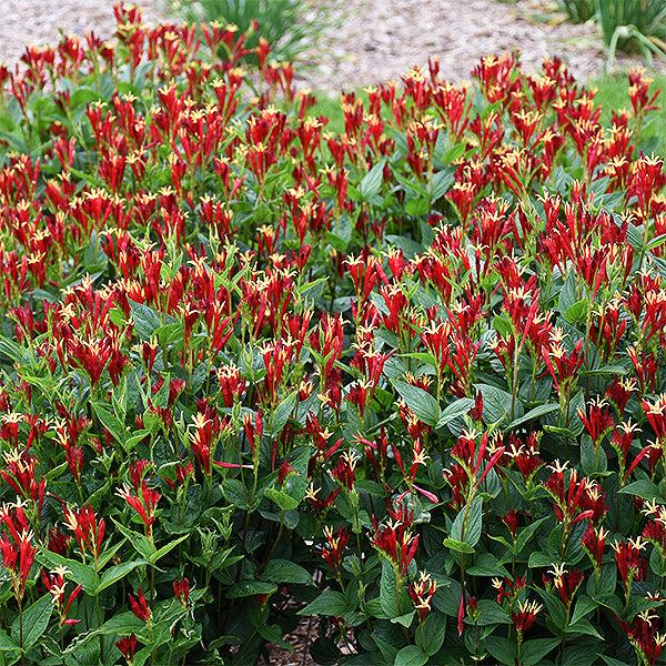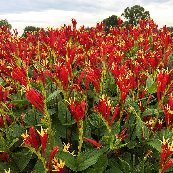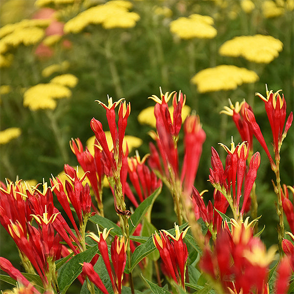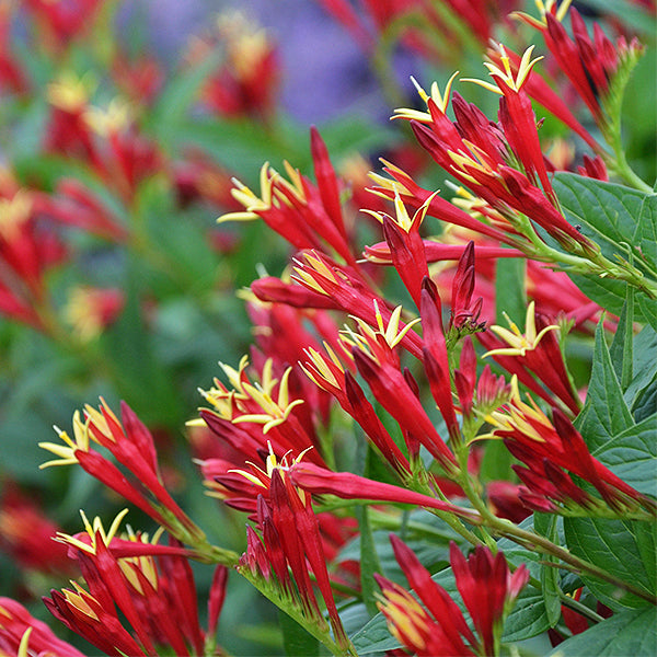 Fantastic upright wedge-shaped foliage boasts brilliantly colored, tubular red blooms with yellow tips and star-shaped openings! Long-blooming throughout summer, the profuse blooms call bees and butterflies, as well as hummingbirds from afar!