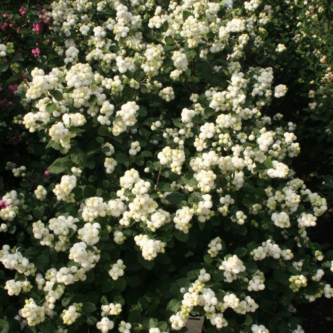A hybrid selection, Symphoricarpos x doornbosii combines the best of its Snowberry lineage, offering improved berry set, sturdier stems, and a neat, rounded growth habit. Its oval green foliage provides a lush backdrop in spring and summer before giving way to its snowy fruit display. Even after frost, the berries persist, making it a magnet for songbirds and a visual highlight in the landscape.