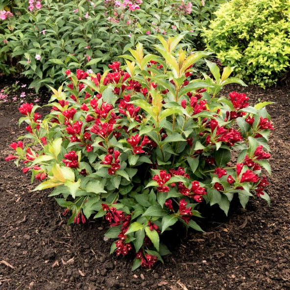 While Weigelas will tolerate a position in partial shade, they do bloom best in full sun. Give them at least 4 hours of direct sunlight. Provide well-drained soil and a moderate amount of water on a regular basis. Top dress with a thick layer of wood chip mulch, but please take care to ensure the mulch doesn't touch the stems directly.