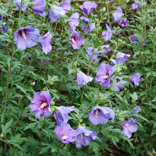 Filling out loose, open and informal branching, the pointed maple leaf-like foliage is a lush green all summer into fall. This easy-care hybrid Rose of Sharon boasts extra-large flowers and positively extraordinary color - cool blue-violet blooms with an almost iridescent effect! Even though this hybrid is seedless, it still produces plenty of nectar to attract pollinators, Paraplu Violet® blooms for weeks on end, through the summer into the autumn, without you having to lift a finger!