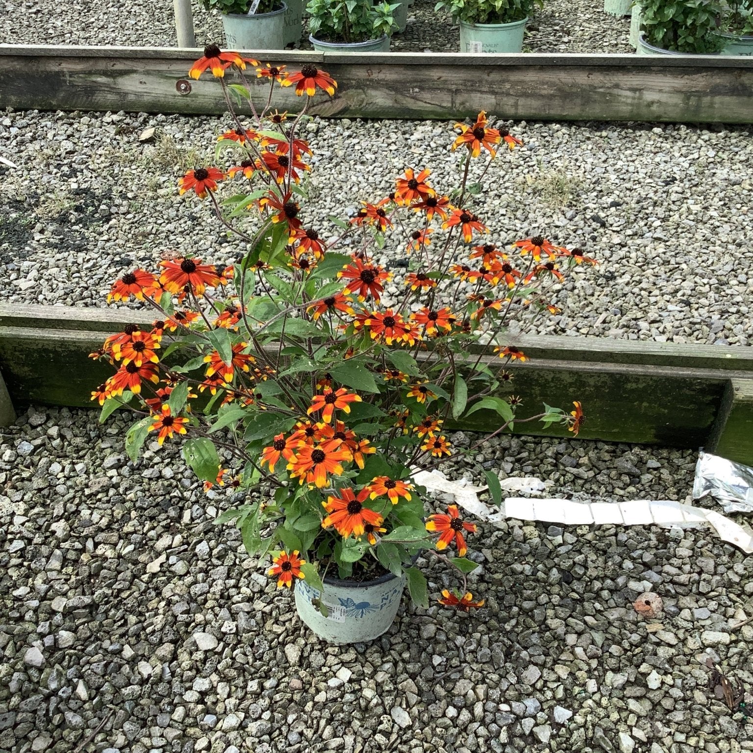 Looking for a fiery garden spark? Meet the Prairie Glow Black-Eyed Susan (Rudbeckia triloba 'Prairie Glow'), a dazzling herbaceous perennial with unique, bi-colored flowers that radiate warmth. This tall-growing, long-blooming beauty flaunts burnt-orange petals tipped in golden yellow with a chocolate-brown center cone.