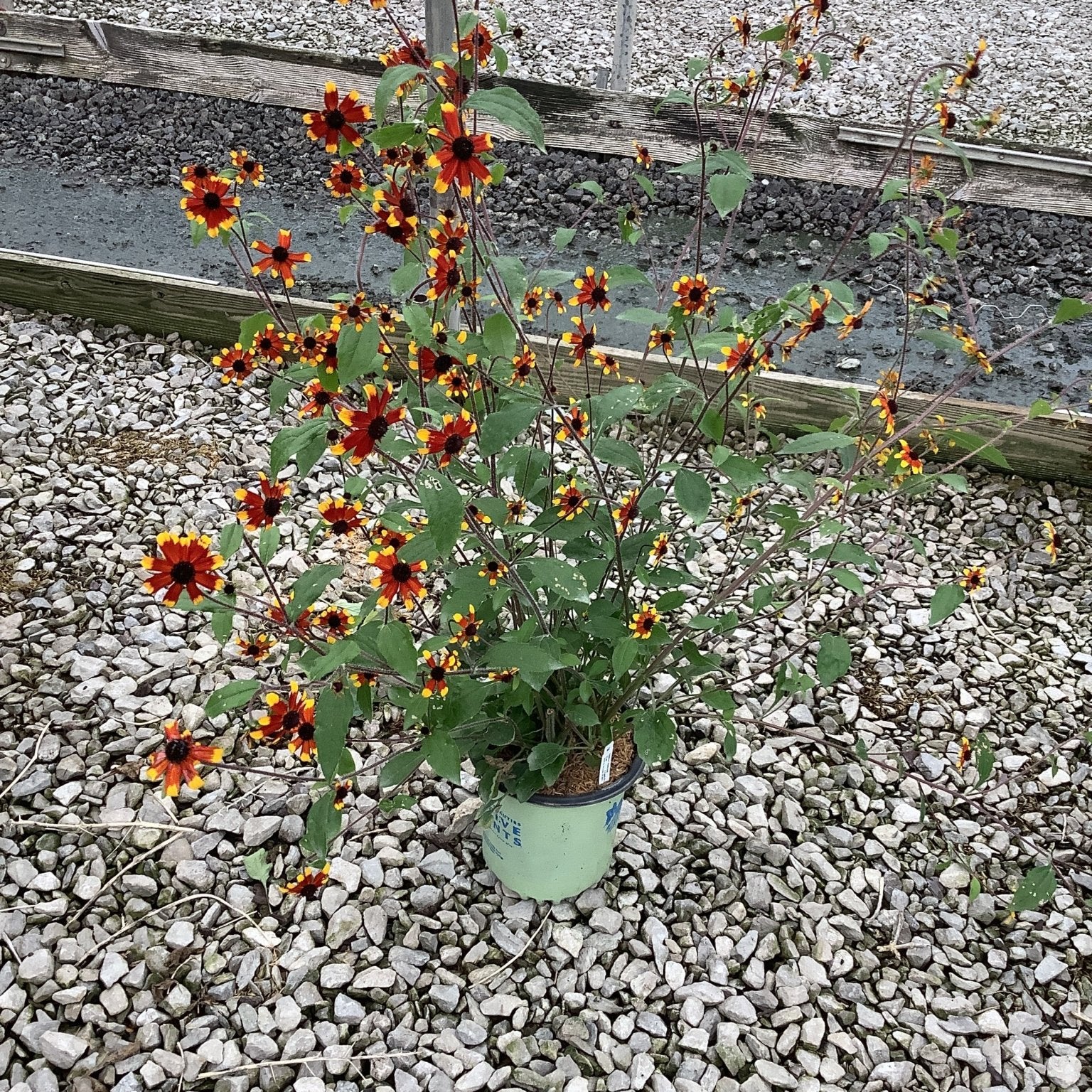 Unlike your typical Black-Eyed Susan, Prairie Glow is a showy hybrid form of Rudbeckia triloba that sports airy, branching stems and masses of smaller daisy-like flowers. The foliage is deep green and slightly rough in texture, providing a lush backdrop to the blazing flowers.