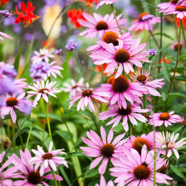 Plant these in long drifts of gentle zig-zags in front of larger shrubs to create a very natural look in your backyard. Coneflowers pair beautifully to create a restful oasis with other cool-toned full-sun perennials, such as False Indigo, Butterfly Bush, Salvia, or Russian Sage. Underplant with Ajuga groundcover to complete the look.