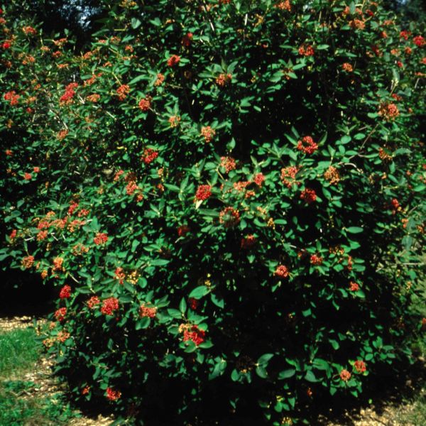 The ovular shape and deep veining of these leaves make them even more delightful in fall when the Alleghany Viburnum is deciduous and brightens to a golden yellow and orange in colder climates. If green is your color, you're in luck! Because the Alleghany Viburnum keeps its green all year long in southern zones and during mild winters of USDA hardiness zones 5 through 8.