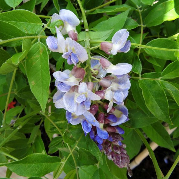 The flowers are fragrant and are born in enormous clusters that can be up to a foot long. They hang from this vigorous plant almost like clusters of grapes. The flowers have a lot of purple on the outside of the buds and grow in a fabulous mix of blues and purples. The colors are darker when they first open and can fade as the flowers age. This is a 'must-have' for the garden!