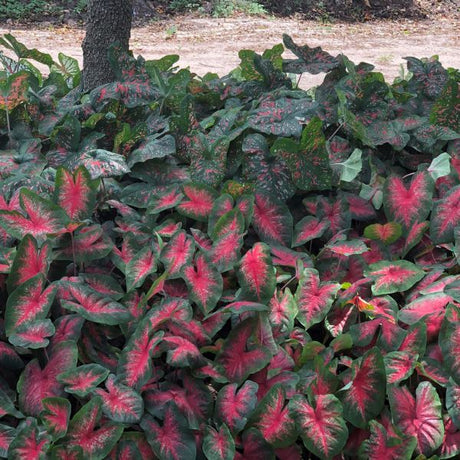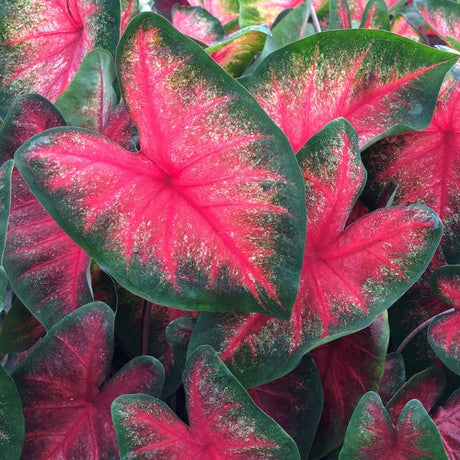 Caladiums are tropical, foliage-forward plants grown from bulb-like corms and beloved for their vibrantly colored, heart-shaped leaves. Their showy, variegated patterns range from crisp whites to electric pinks and bold reds with striking green veining. Perfect for shady gardens, understory beds, and container displays, Caladiums provide big impact with minimal effort and are naturally deer-resistant for added peace of mind.