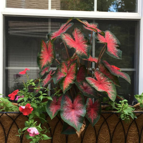 Yes, Caladiums are ideal for container gardening, porch planters, and indoor displays. Their compact size and bold leaves make them standout accent plants in window boxes, balcony containers, or sunny sunrooms with filtered light. Indoors, provide bright indirect light, and keep soil consistently moist. They're especially popular for tropical-themed decor and shaded outdoor living spaces.