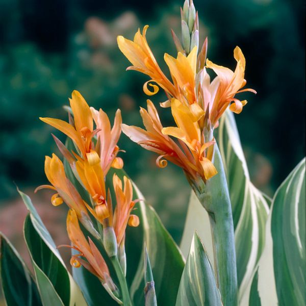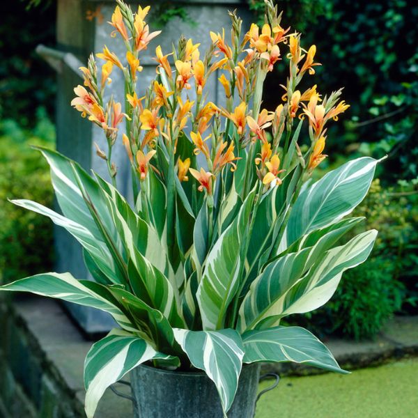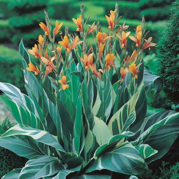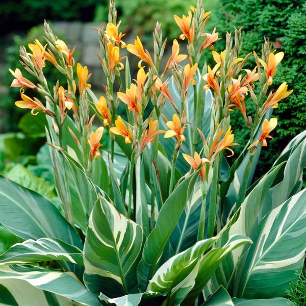 Variegated Stuttgart Canna Lilies grow from fibrous rhizomes and they grow fast! These flamboyant blooms flower all summer! Hardy outdoors year-round in USDA growing zones 8 through 11 but can be enjoyed as either annual accents in all growing zones. Canna can also be lifted and stored for the winter in a frost-free location in all northern climates.