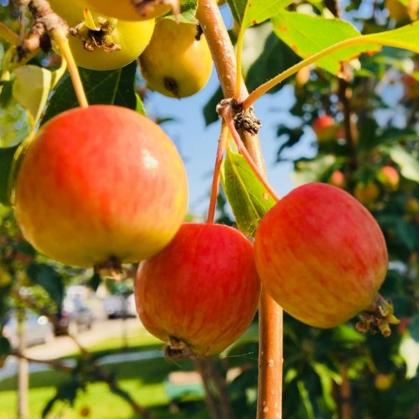 Heavy producing trees with vigorous growth. Producing bushels of small, crisp and sweet oval-shaped fruit with rosy skin! Great for canning and jelly and for kids to snack on! Filling out with lush green foliage throughout the growing season, these are handsome trees throughout the growing season!