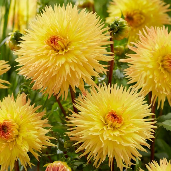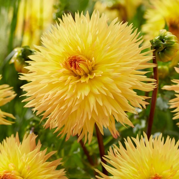 Gorgeous showy spikey blooms of the most vibrant yellow, the Sassafras Dahlia (Dahlia 'Sassafras') is a starburst of slender, spikey petals! Each of these fully double blooms can grow quite large and is each bespeckled with a reddish center.