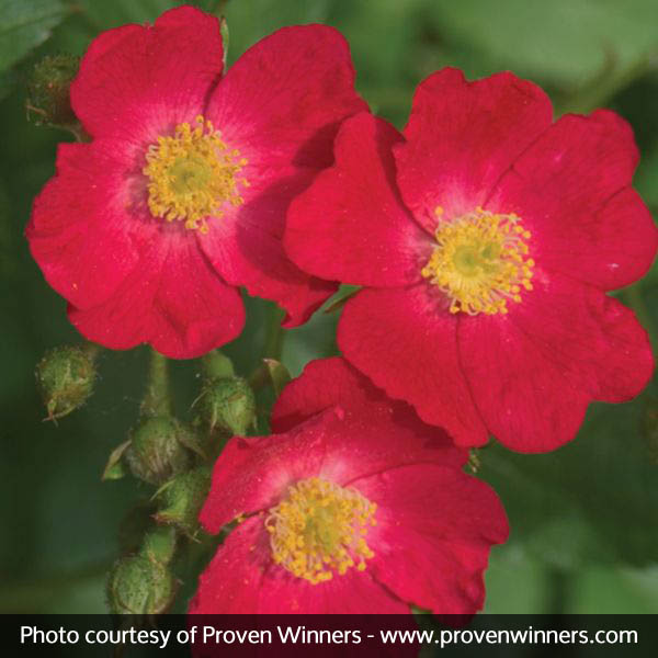 One of the easiest Roses you can grow, Candy Oh! will fill your garden with carefree candy apple-red flowers all season long! They are singles and look like Wild Roses with brilliant bullseyes of glowing bright yellow at the center of each darling bloom! Their strength is in their numbers and they smother this entire rounded little Shrub Rose!