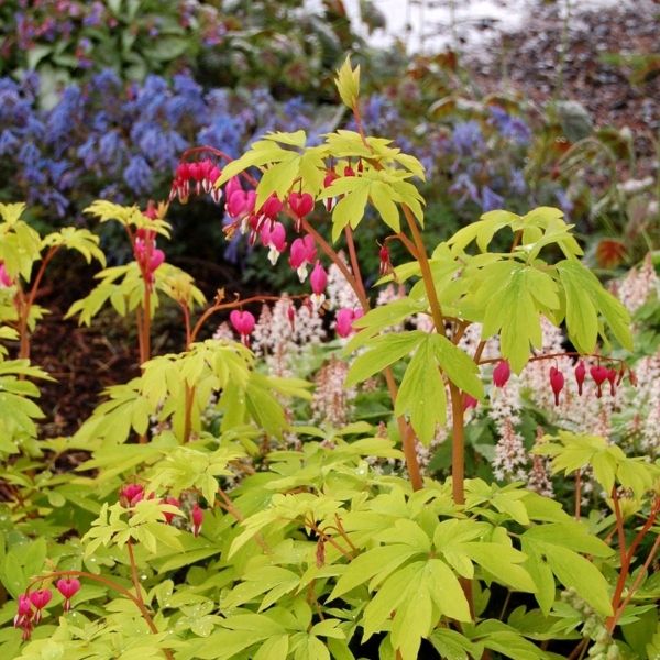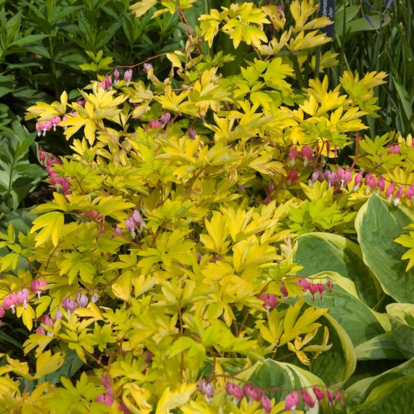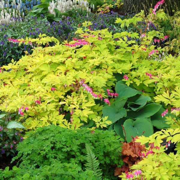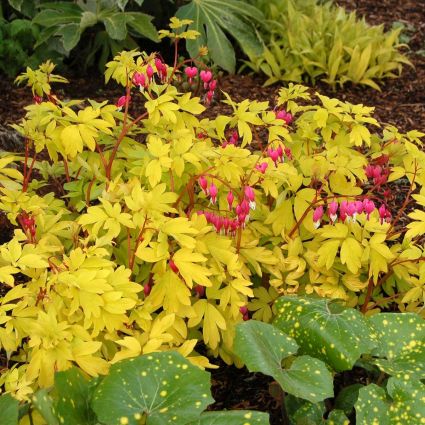 The blooms look wonderful against its bright gold foliage. Bleeding Heart's should be planted in partial sun to partial shade but will also do well in full shade.