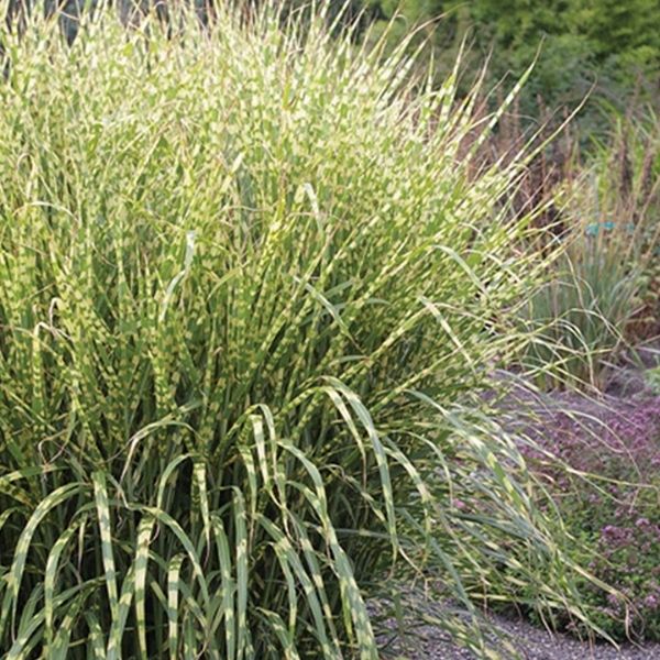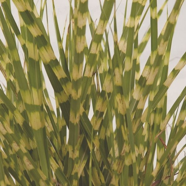 This tall clumping grass, sometimes called Zebra Grass because of its stripes, gets as tall as 6 feet when in bloom, with a generous fountain-like spread! If that isn't enough, the broad, arching blades are apple green with dramatic, wide golden yellow bars that repeat all down the length of each blade, giving them a funky striped look!