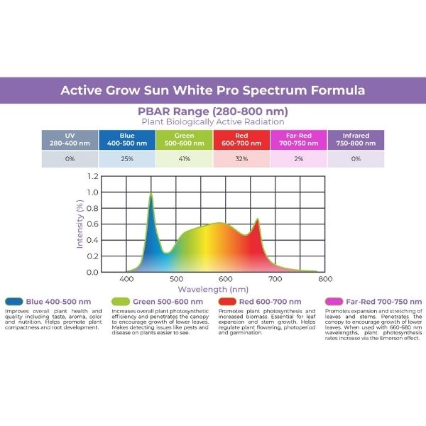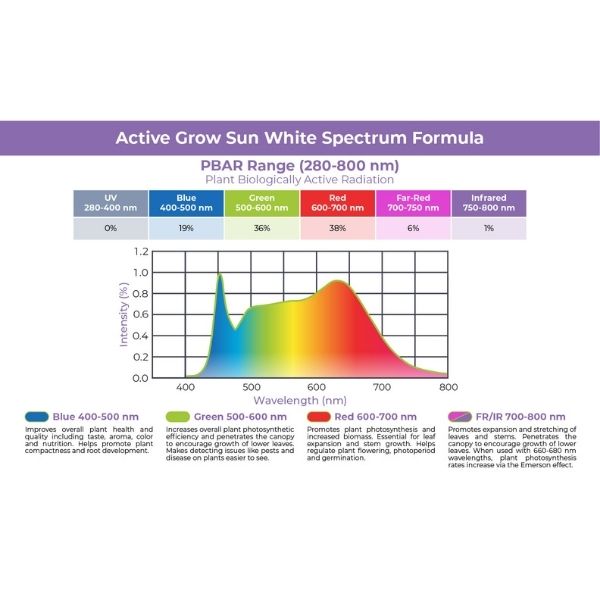 Choose between two specially calibrated spectrums, including Sun White Spectrum that mimics natural sunlight conditions and boosts photosynthesis rates on new growth with a high color rendering index (CRI). Or, select Sun White Pro Spectrum for healthy vegetative growth, root development, tight internodal spacing and phytochemical production.