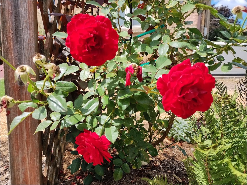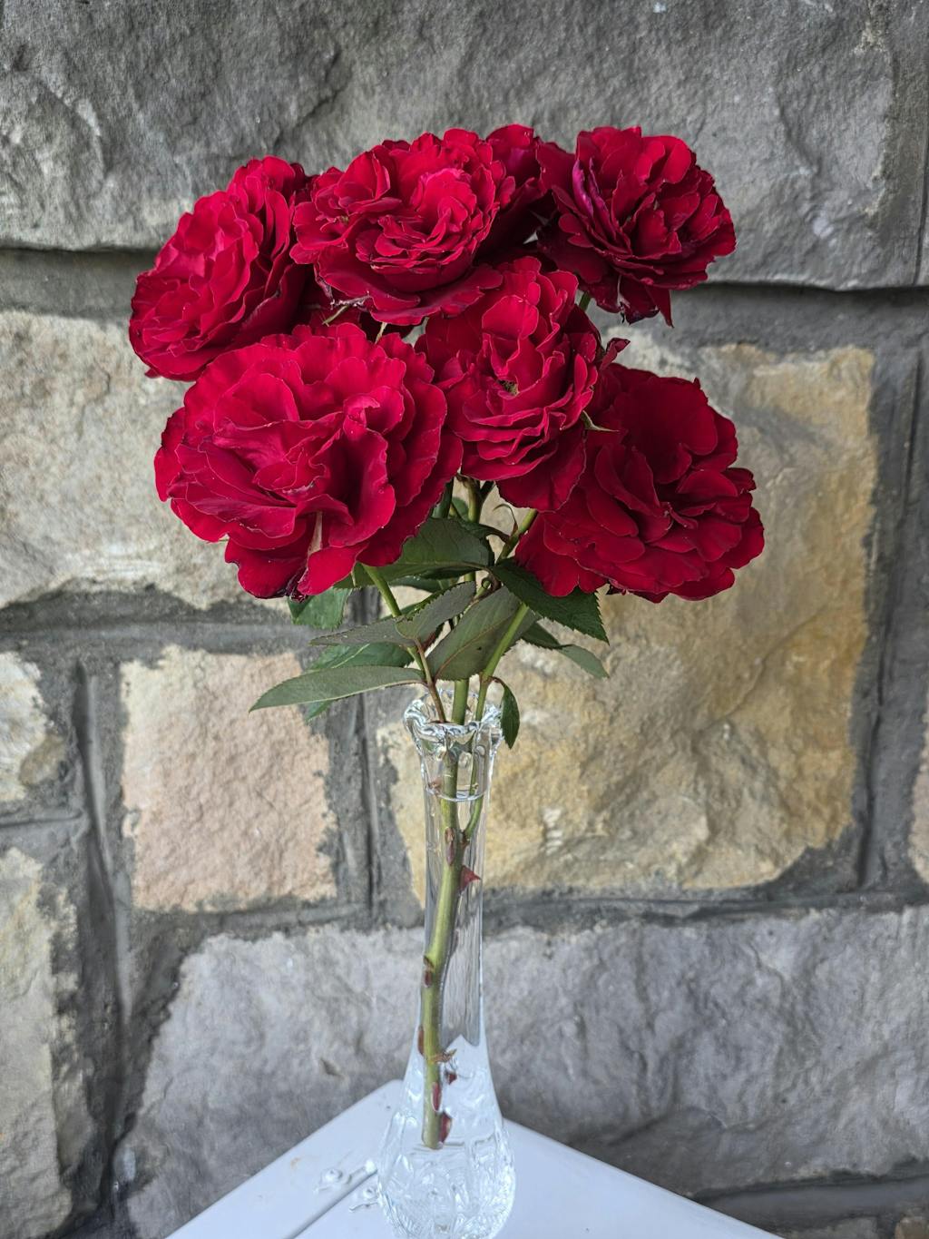 Climbing Roses are actually very hard-working vertical elements for today's smaller yards. When you start with a classic shape like these fully double, huge blooms - it's so easy to take the look modern, retro, old fashioned, formal, rustic, or whimsical. It all depends on the styling and choices you make! That saturated old-fashioned true red will shine through any landscape design!