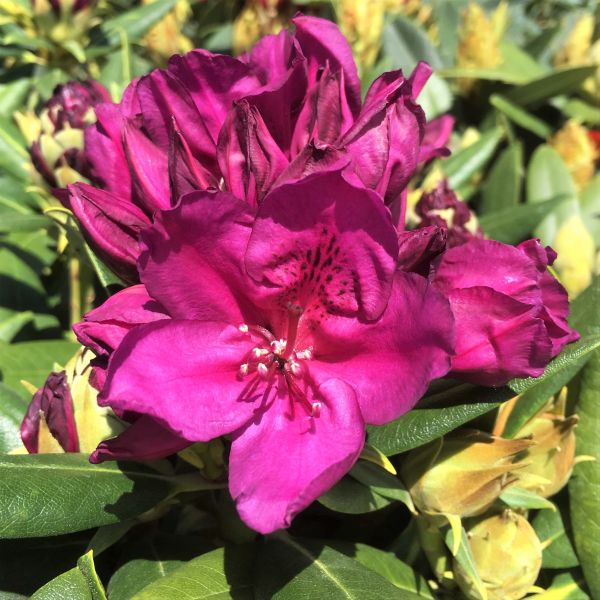 This compact variety stays short and has a unique spreading form. Rich, vibrant plum wine-colored flowers develop on long trusses above attractive evergreen foliage. Every bloom is daubed with scarlet red "blotch" for added depth.
