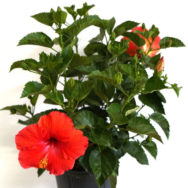 Growing 6-8 feet in height, sometimes larger when planted outside, these shrubby bushes can reach a 4-8 foot width. President Red adds drama to indoor spaces and outdoor landscapes alike! Easy to care for, Tropical Hibiscus do not like being moved around a lot. Preferring to settle into an area free of drafts in a bright sunny location. Moving plants indoors for the winter (or back outside in spring) may result in a bit of leaf drop as they reacclimate to their new surroundings, but fret not! Once they do get settled, they very quickly recover!