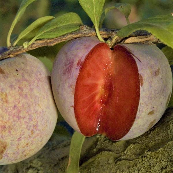 Dapple Dandy's exterior is covered in a smooth, shiny skin closely resembling that of a plum. Its greenish-yellow red-spotted exterior develops into a maroon and yellow dapple as it begins to ripen. A regular taste test champion for its distinct plum-apricot flavor! It is a moderately late ripening tree that can be pollinated by the Santa Rosa Plum.