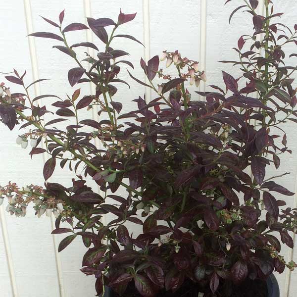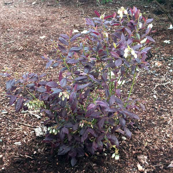 Watch as the blooms eventually develop into masses of tasty, purple blueberries. The purple foliage color mellows to a soft green washed with red wine color.