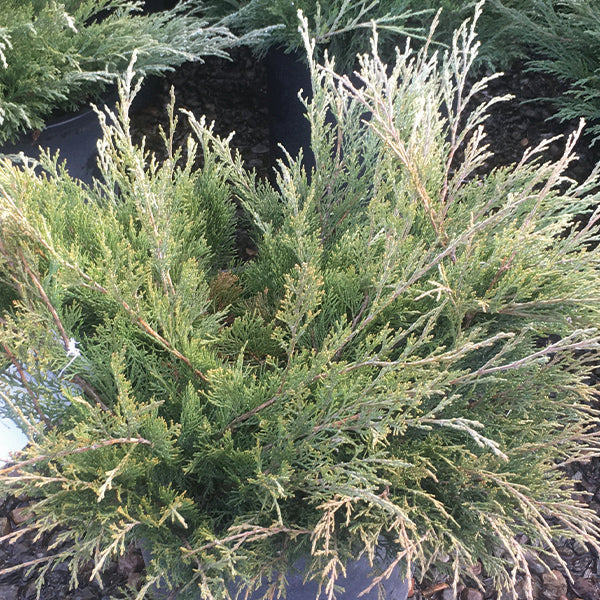 You may be surprised how relaxing a solid mat of these highly textured plants will be. Plant them four to six feet apart on center, measuring from the center of one to the center of the next. For faster coverage, plant closer together. Or, select the largest container size we have in stock to gain a big head start. Mulch between plants, taking care not to cover the branches. Pull mulch back away from the main stems.