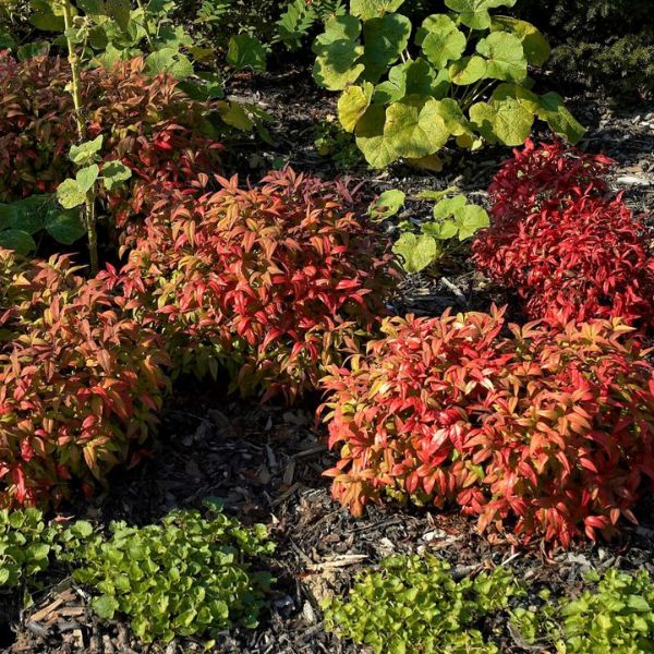 The lacy texture and space-saving size pop as a border row or edging! Try adding color to the weary row of conifers you have along your foundation hedge, both hiding their bare leggy lower stems as a facer plant, dwarf Nandia will also bring in that year-round color! Long low, winding hedges or en masse plantings will surround your landscape or your business in low-maintenance curb appeal that will turn heads each season!