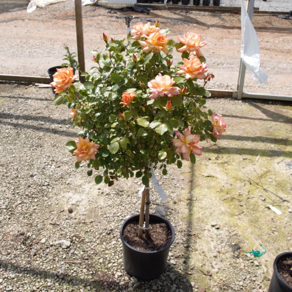 The blooms come in clusters on long stems, perfect for cutting. One stem makes a complete bouquet! This is a very hardy Floribunda Rose that does extremely well in colder climates from USDA planting zones 5 to 10. Growing atop its 2-3 foot tall standard, these Rose trees command attention at 5 - 8 feet tall when in full bloom thanks to those elegant long stems, but these Roses canopies only spread 3-4 feet in width.
