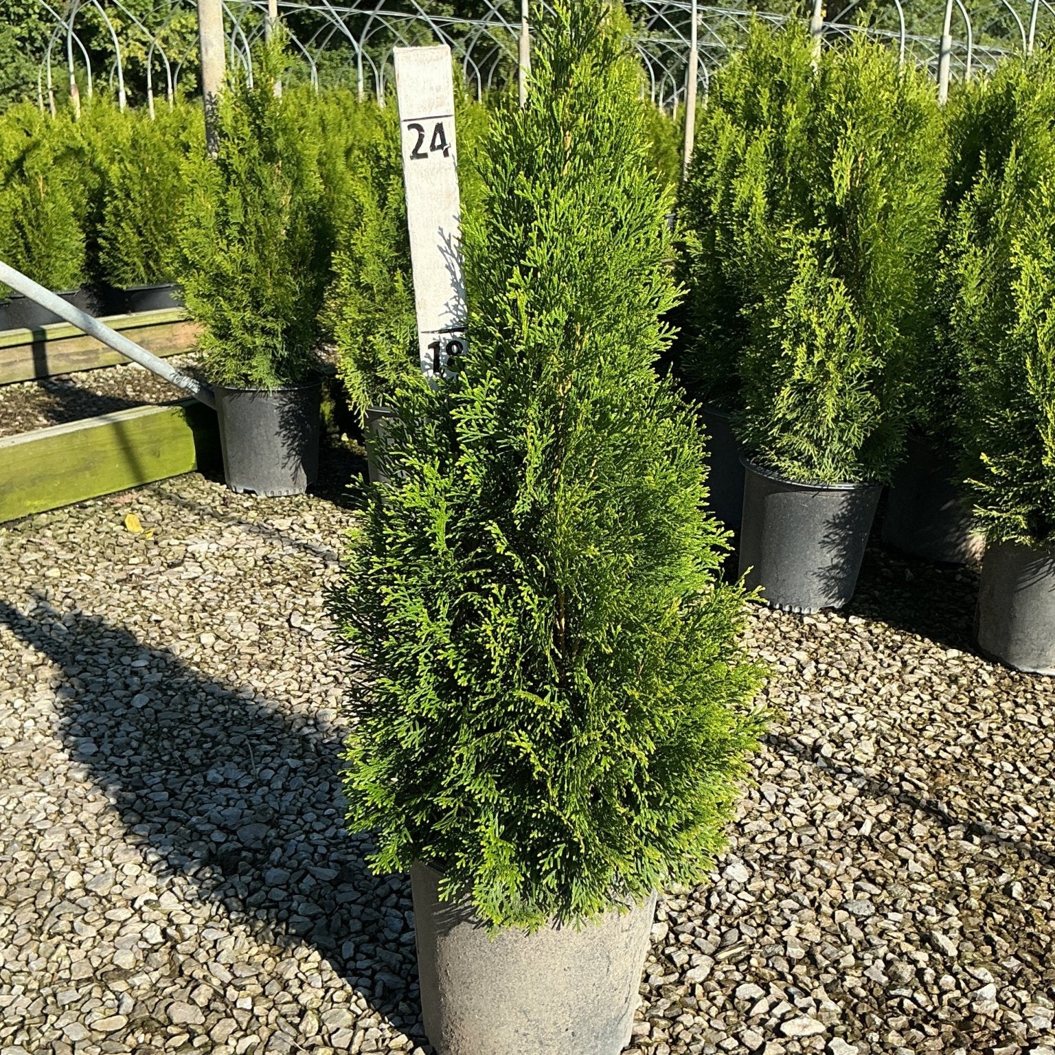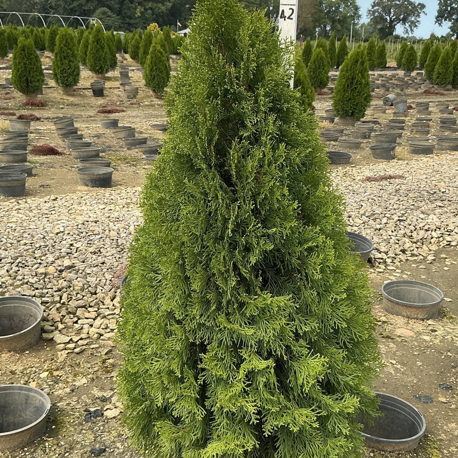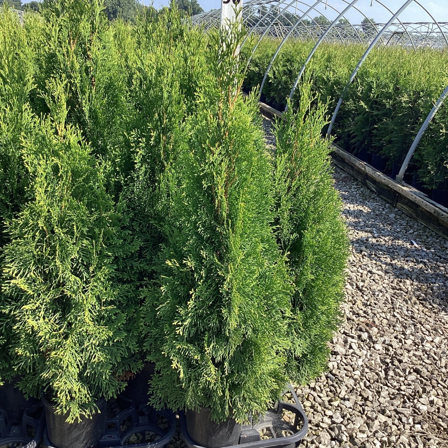 This is a very popular selection because of the overall uniform, narrow, and upright pyramid shape. Cold hardy, these are beautiful workhorses that provide a full, lush screen. Best of all? They are quick growers.
