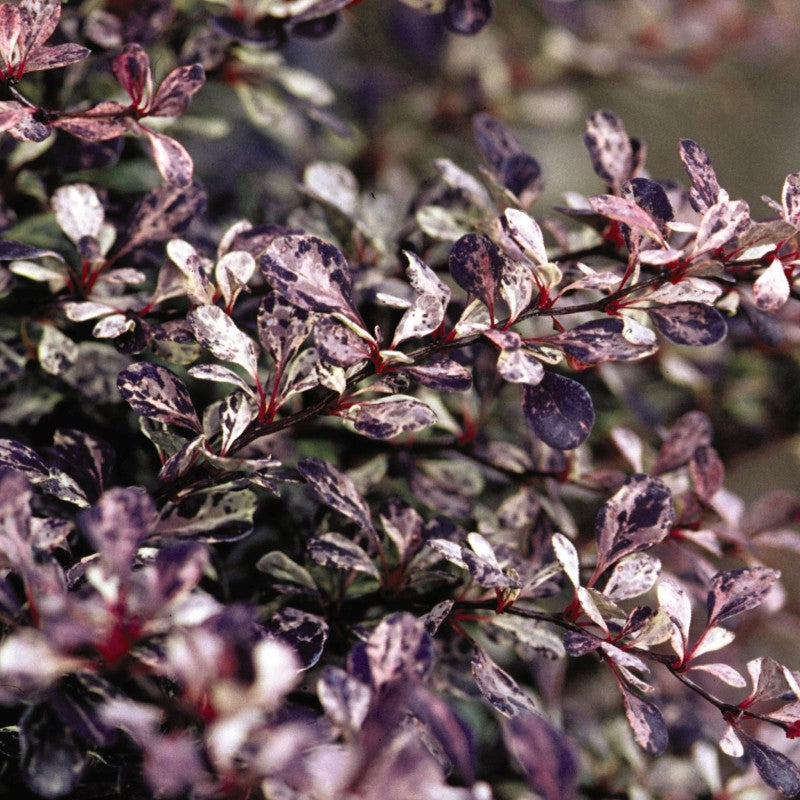 This showy Japanese Barberry shrub is a show-stopper for its stunning foliage color. It has variegated leaves in the shades of purple, pink, and rose! It can tolerate some shade but its color will be very different, tending toward green with pink and red accents. This dramatic color stands out in the landscape even though it is deciduous, the leaves will fall off for the winter but the matching stem colors remain!
