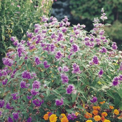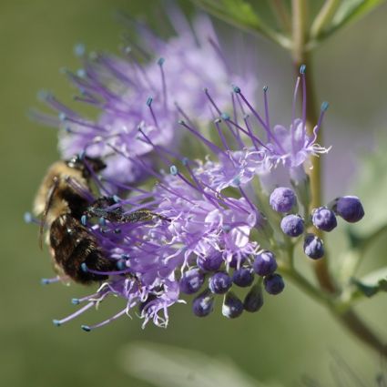 This wonderful flowering specimen is also often called the Blue Mist Spirea due to its similarity to the Spirea bush, but the late-season bloom and color sets it apart from the rest! The late summer and fall flower display is a boon for pollen-seeking bees and beneficial insects, and a fine nectar source for butterflies!