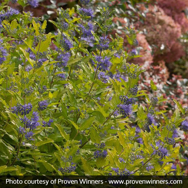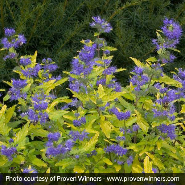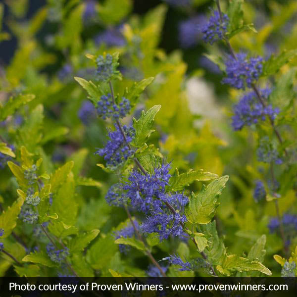 It's always nice when you don't have to choose between striking foliage and luscious blooms. Lil Miss Sunshine® Bluebeard PP 22,160 (Caryopteris x clandonensis 'Janice') has both! A Proven Winners® ColorChoice® selection, this new Caryopteris variety is a garden stunner for sure!