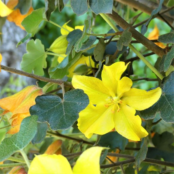 Flannel Bush. The name conjures up cozy shirts and crackling fires, sweet hot cocoa and melty s'mores. But the reality is that this vining shrub isn't like that at all. It is a super-drought-tolerant California native that sports some of the brightest yellow flowers you've ever seen every spring!