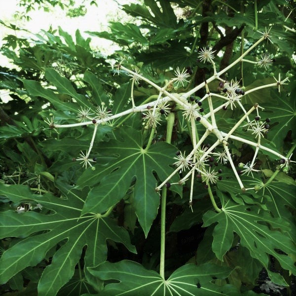 Japanese Aralia, also known as Paper Plant or Fatsia Japonica, is a broadleaf, evergreen shrub with ornamental features. Plant several for a lush hedge, or plant just one as an accent in your side yard. These even do well as houseplants or as container plants your patio or front porch.