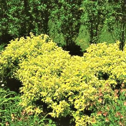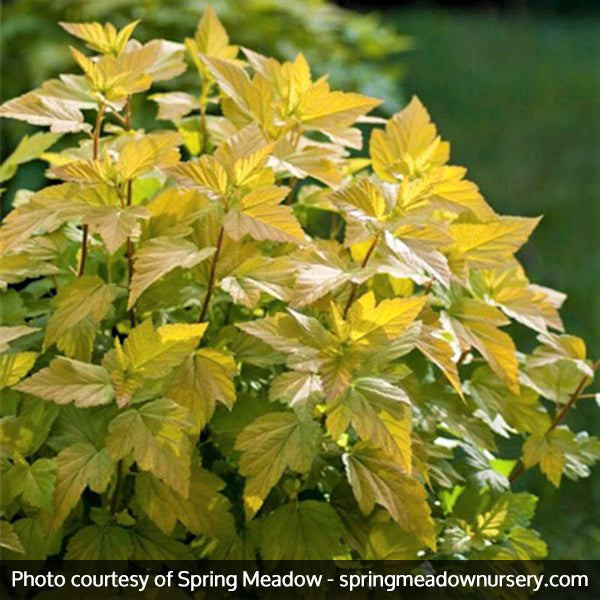 The Ninebark 'Dart's Gold', Physocarpus opulifolius 'Dart's Gold', is named for its broad three-lobed golden spring foliage, which turns lime green in the summer. It matures to 4'-5' with an equal spread.