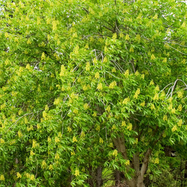 Adding a mix of native trees to your landscape is a rewarding initiative that pays off in so many ways. Support your local ecology, and enjoy a relaxing space you can be proud of. With a beautiful upright rounded form, the Ohio Buckeye Tree (Aesculus glabra) works as a standout specimen or in a natural grouping. You'll be thrilled with the exceptional spring-flowering display. Also known as the Texas Buckeye, or Horse Chestnut, this is no "wimpy" tree. Everything from the corrugated leaves to the corky bark to the leathery, prickled nut husks looks strong!