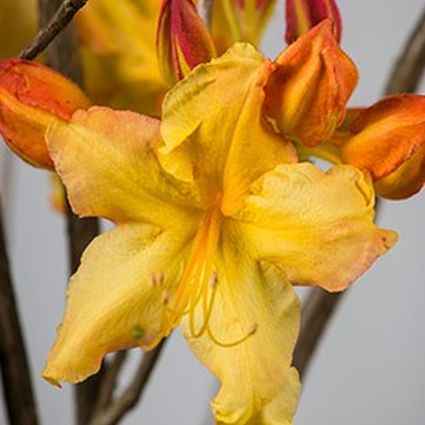 Like a brilliant splash of sunshine in the spring yard, Sunbow® Solar Flare™ Azalea (Rhododendron 'QbackB' PP27083) features bright yellow blooms, with just a hint of orange for an additional dash of spice. The buds have a darker orange-red hue, adding a two-toned effect as the flowers come into bloom! Watch as bees, butterflies, Hummingbirds, and curious neighbors flock to your yard to get a better look!