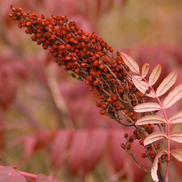 The Sumac has spectacular colors and endless appeal! An American native shrub or small tree, the colony-forming plants are known for their ability to naturalize! The combination of their unique spires of red berries, Smooth Sumac (Rhus glabra) is a staple in just about all geographical locations around the US!