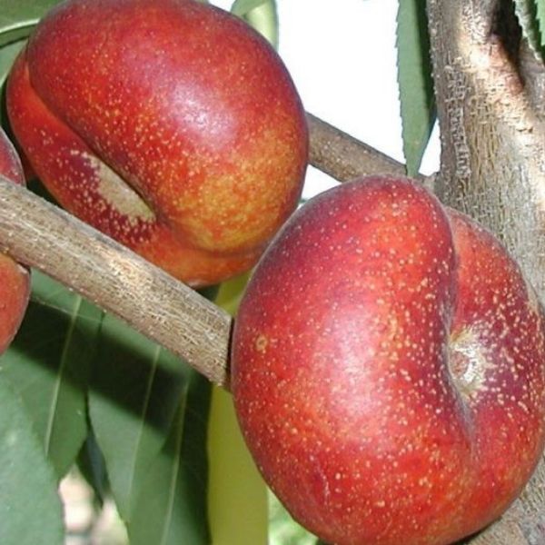 Disc-shaped red fruit, the Honey Halo Nectarine Tree (Prunus persica var. nucipersica 'Honey Halo') is a unique donut-style Nectarine with smooth yellowy-orange speckled skin that adds to the snappy bite of the sweet and flavorful interior! With that true Nectarine flavor, these are easy to eat, healthy fruit that kids love!