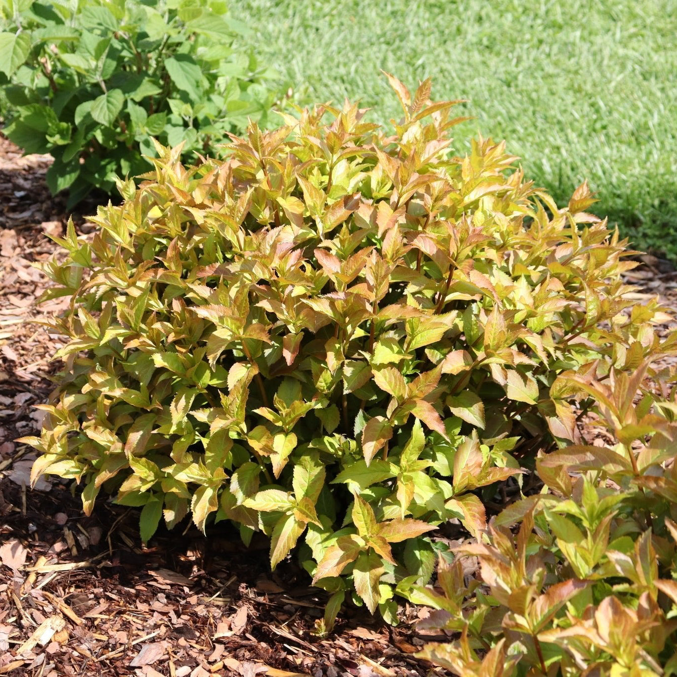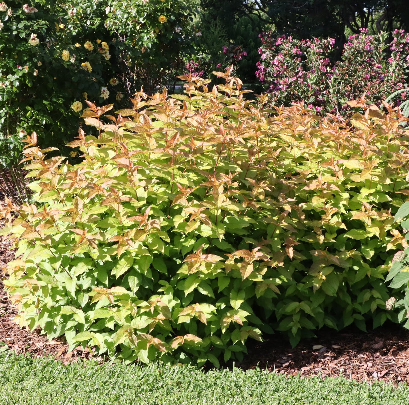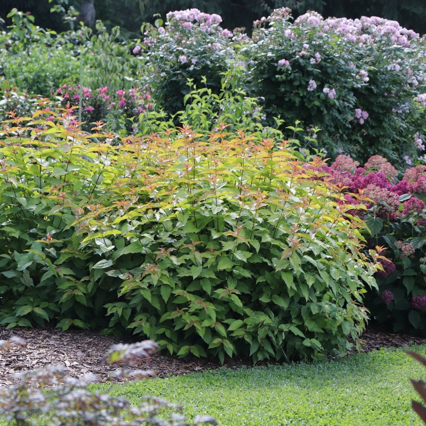 The real show begins in spring when the new growth emerges. You’ll be treated to a delicious blend of orange and copper tones that seem to glow against the deep, dark burgundy stems. As the season progresses into summer, the leaves transition to a unique "bronzed chartreuse," keeping the garden's palette interesting even when other shrubs have faded to a standard green. The texture is lush and full, providing a perfect backdrop for the rest of your garden.