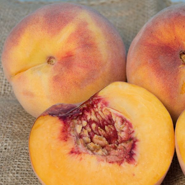 Round with yellow skin and a scarlet blush, your Rio Oso Gem Peach presents a stunning picture hanging amid its vibrant, green foliage. Rio's yellow freestone flesh is somewhat coarse yet juicy, with a delightfully rich, sweet flavor with orange undertones and a tart finish.